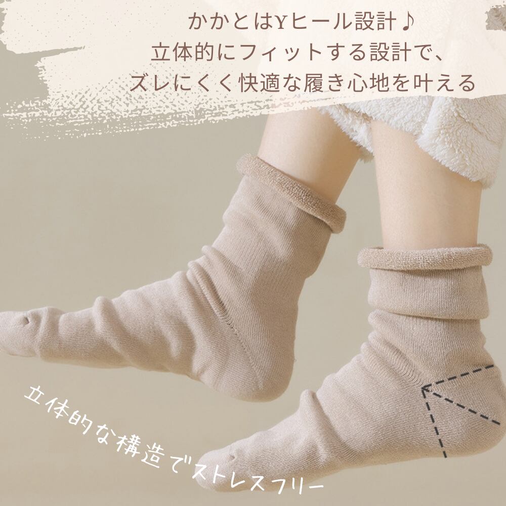こちらのルームソックスはやさしくフィットする立体かかと設計で、ぬげにくく快適な履き心地を実現しています。