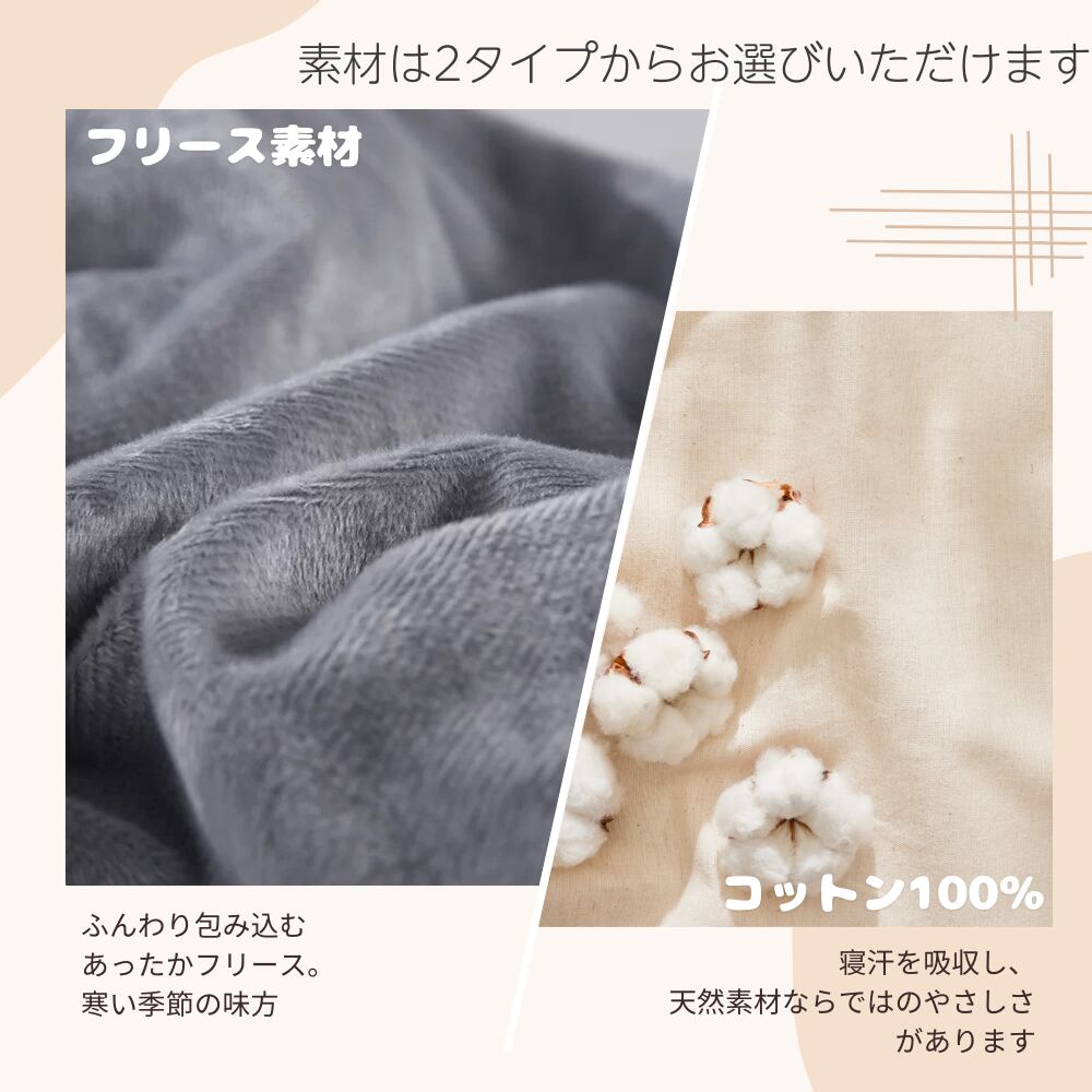 素材:カバー、フリース素材、ポリエステル100%、コットンタイプ、コットン100%、クッション、ポリエステル100%