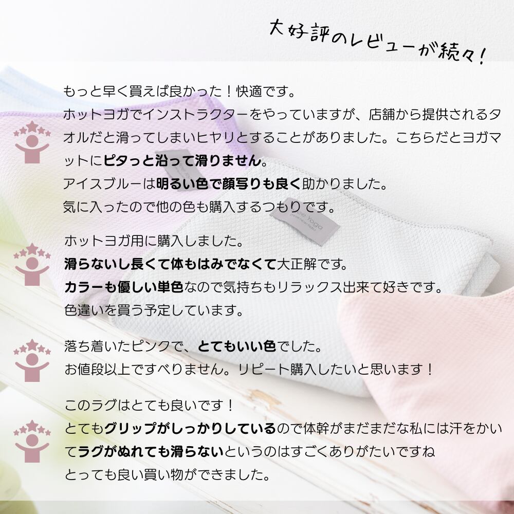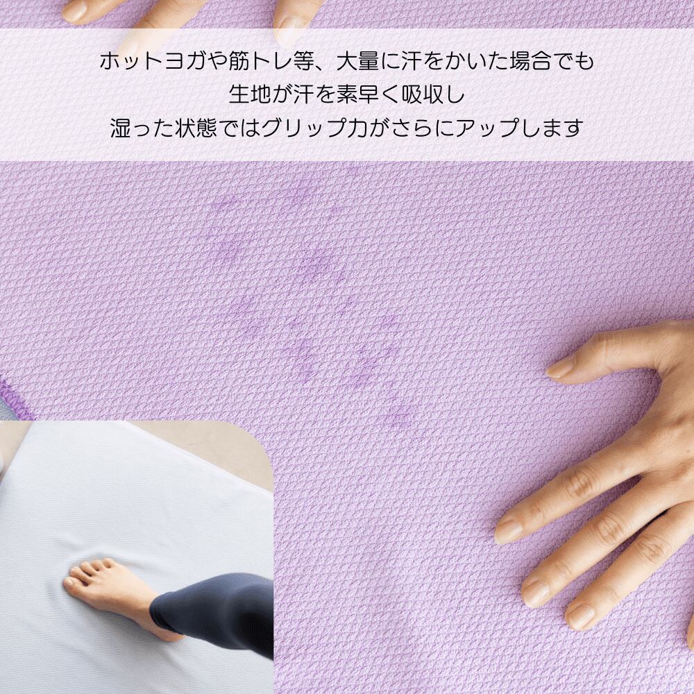 本商品はマイクロファイバー素材を使用しているため、汗を素早く吸収し、ホットヨガはもちろん、常温ヨガやピラティス 、ストレッチなどにご利用いただけます。タオルのように持ち運びやすいので、ジムにも持って行きやすいです。