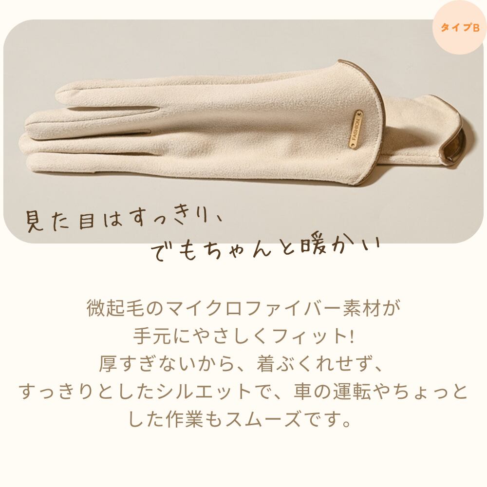 ふわりとした微起毛素材が、指先までやさしく包み込みます。寒さを防ぎながら、動きやすくて、見た目もすっきり。
