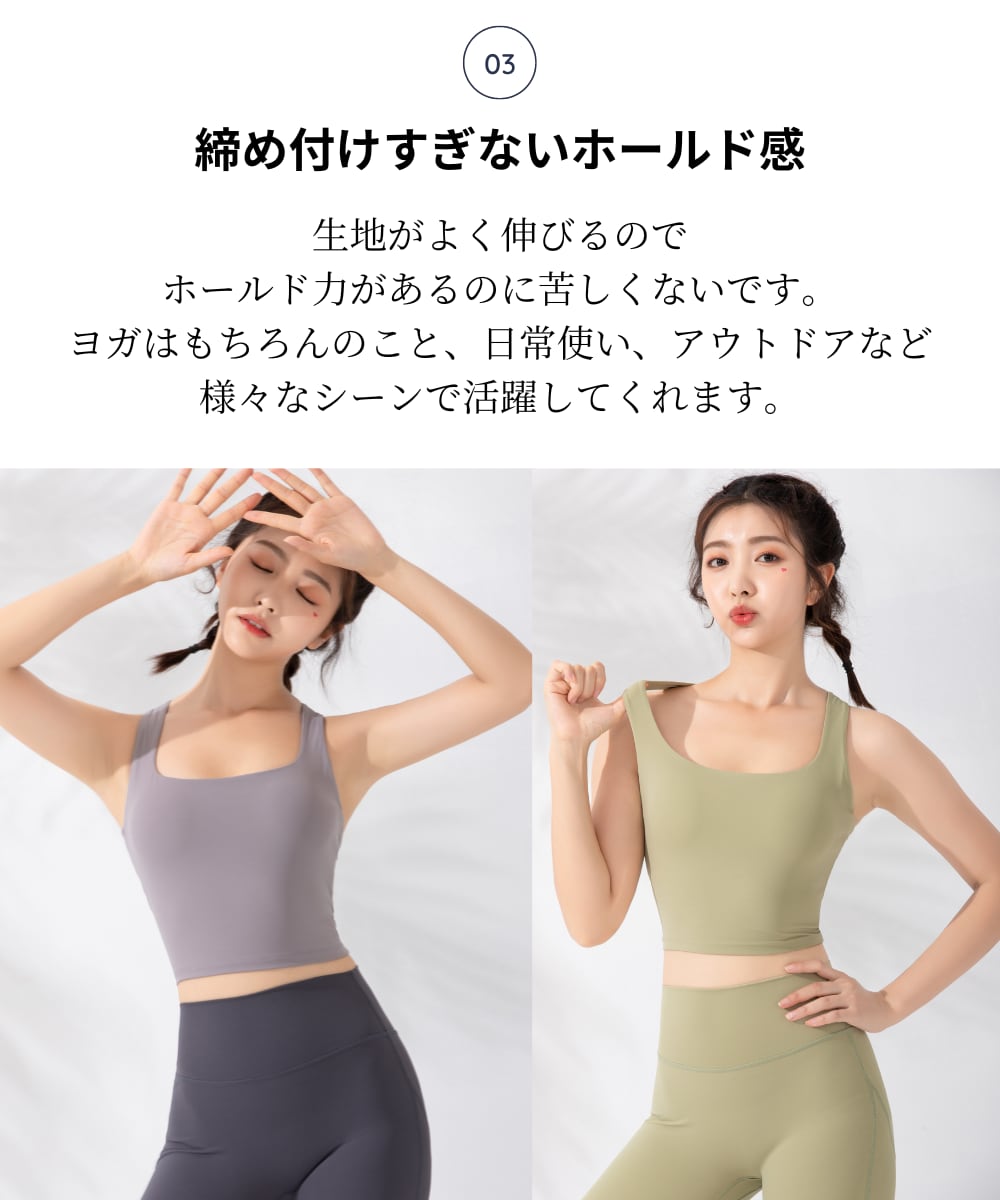 ホールド力がありながらも快適な着心地を実現しました。優れた吸汗速乾性とサラッとした肌触りが特長で、ホットヨガやランニングなどの激しい運動時にも快適にご使用いただけます。