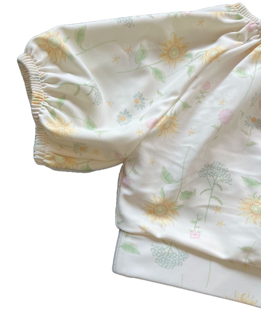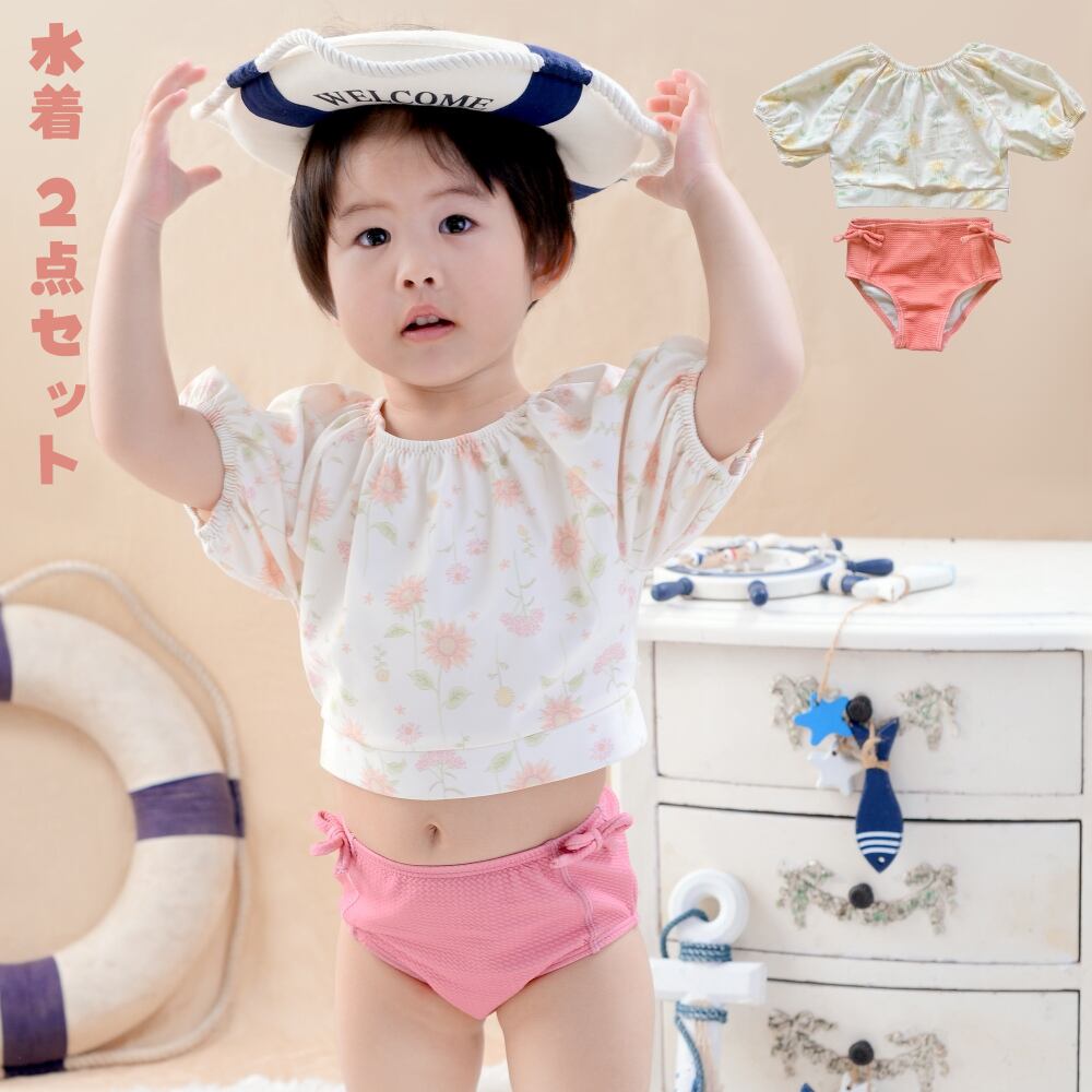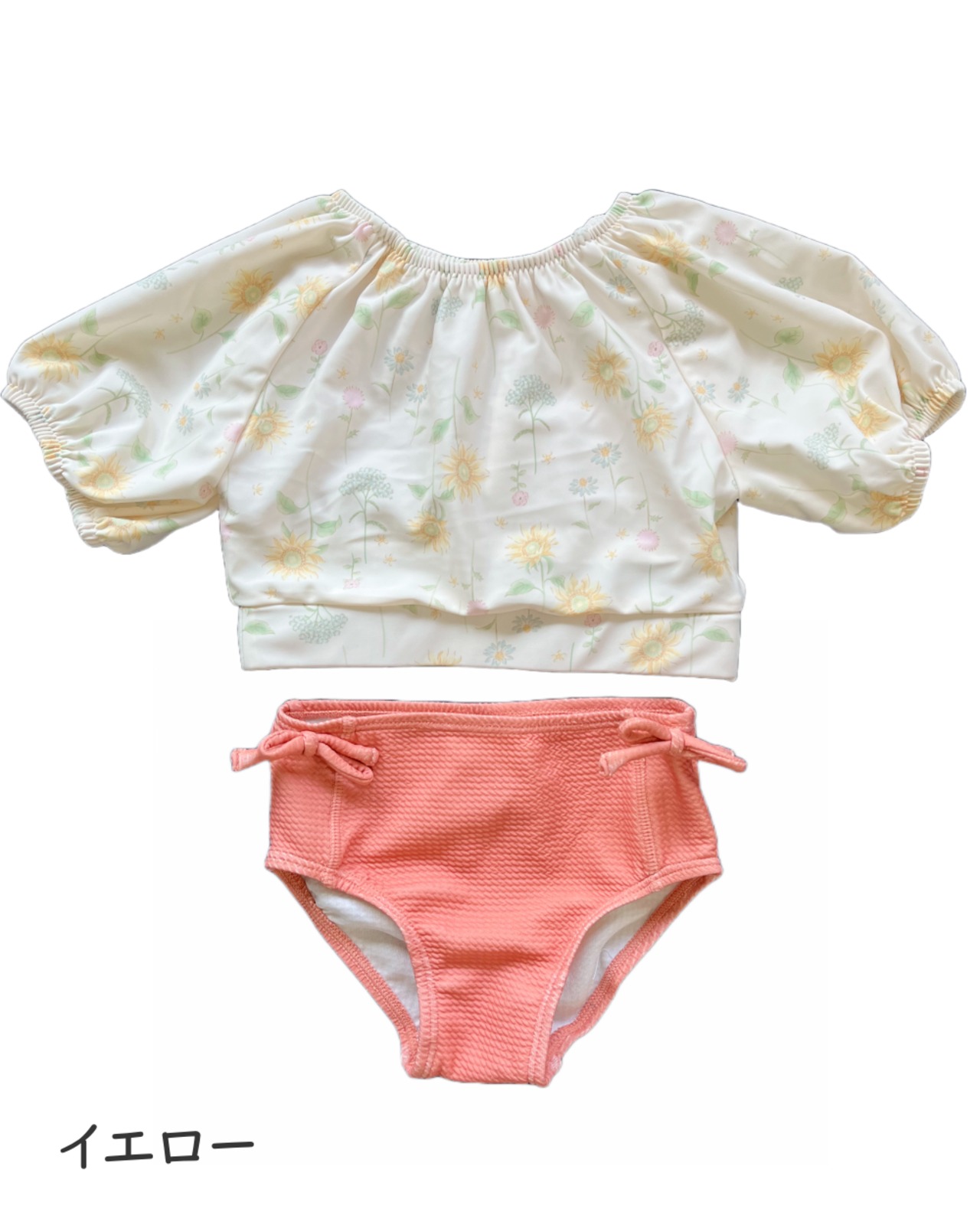 キッズ 水着 女の子 2点セット セパレート水着 かわいい 半袖 パンツ おしゃれ 子供 ベビー ジュニア 袖あり フレア袖 フリル パステルカラー 花柄 ひまわり ぽこぽこストレッチ 90cm 95cm 水遊び プール 水泳 海 露出控えめ 脱着しやすい 速乾