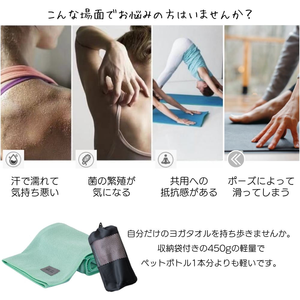 本商品はマイクロファイバー素材を使用しているため、汗を素早く吸収し、ホットヨガはもちろん、常温ヨガやピラティス 、ストレッチなどにご利用いただけます。タオルのように持ち運びやすいので、ジムにも持って行きやすいです。